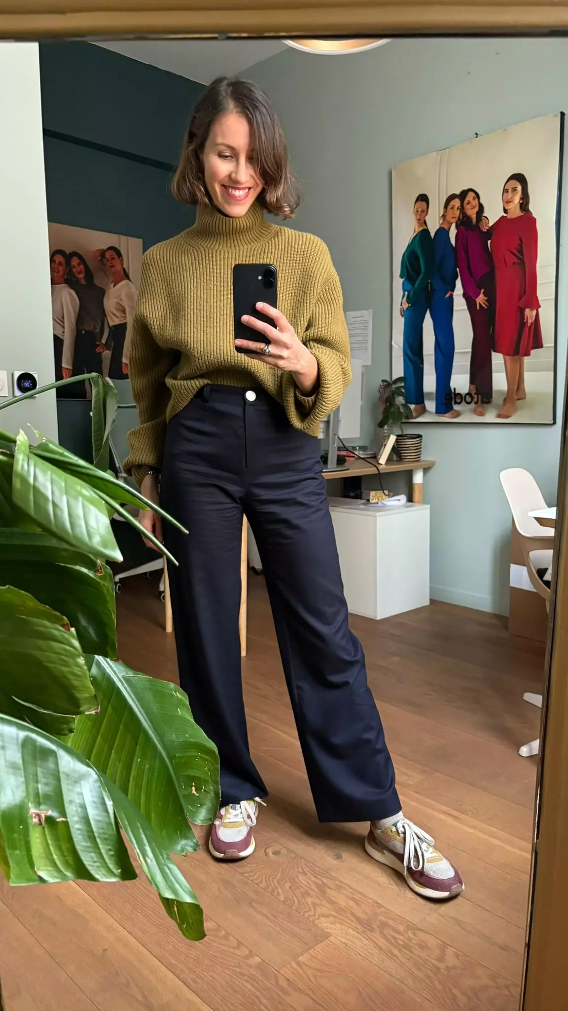 Quand tu relies tes chaussures au haut, tu crées un axe vertical. Le regard circule du haut vers le bas, ainsi, le look paraît plus dynamique.