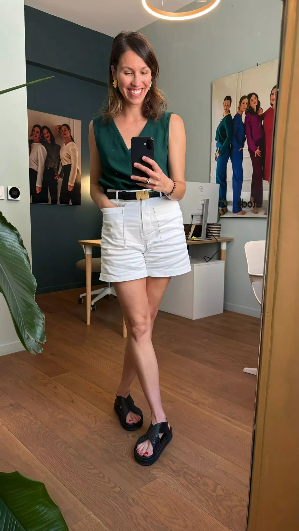 Avec des chaussures nude, l’effet est plus discret. Avec des chaussures colorées, la ceinture devient un rappel de couleur. Et ce rappel rend le look lisible.