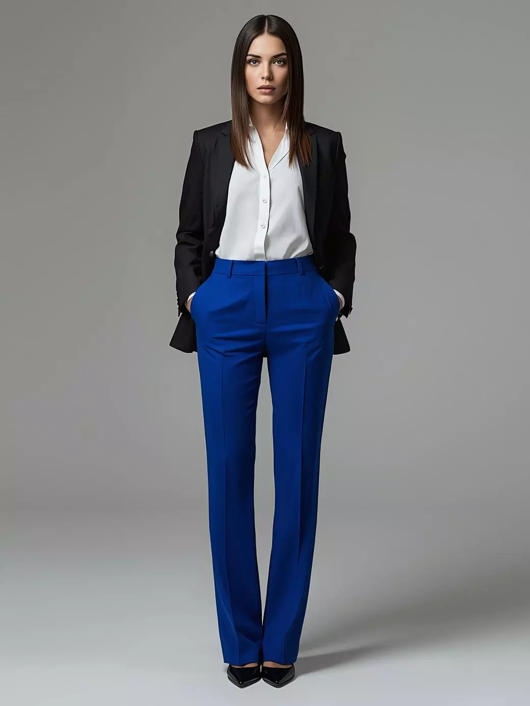 - une chemise blanche avec un pantalon bleu roi et une veste noire cintrée pour un style professionnel affirmé,