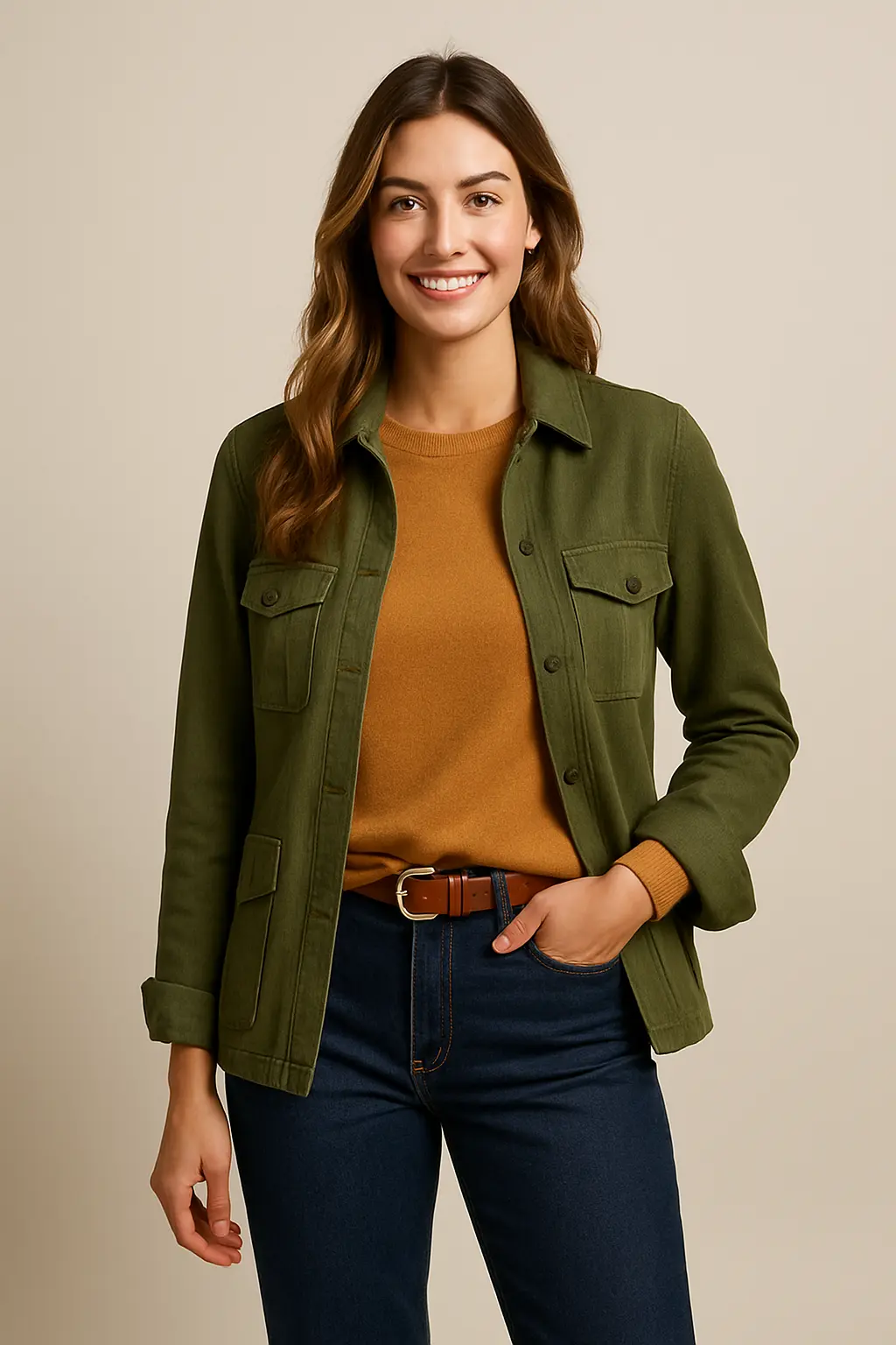 - ou un pull camel porté avec un jean brut et une veste vert olive.