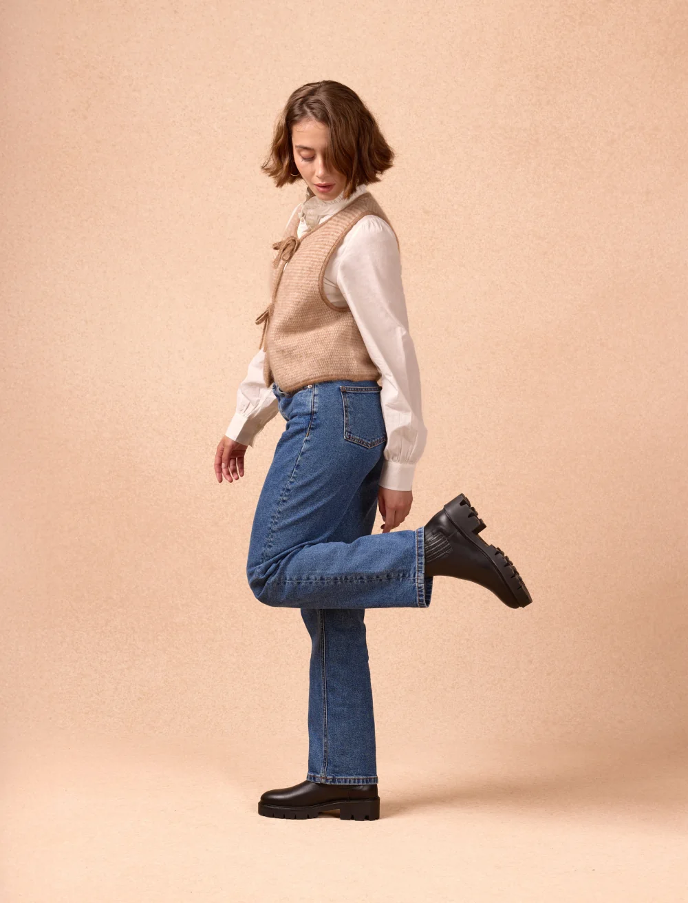 Les bottines et les boots sont de très bons alliés d’un jean large. Elles donnent du caractère à ta tenue tout en restant pratiques. Si ton jean est long ou tombe bien, une bottine structurée (qu’elle soit un peu rock, un peu élégante, ou plus casual) permet d’équilibrer le volume et d’ancrer la silhouette.